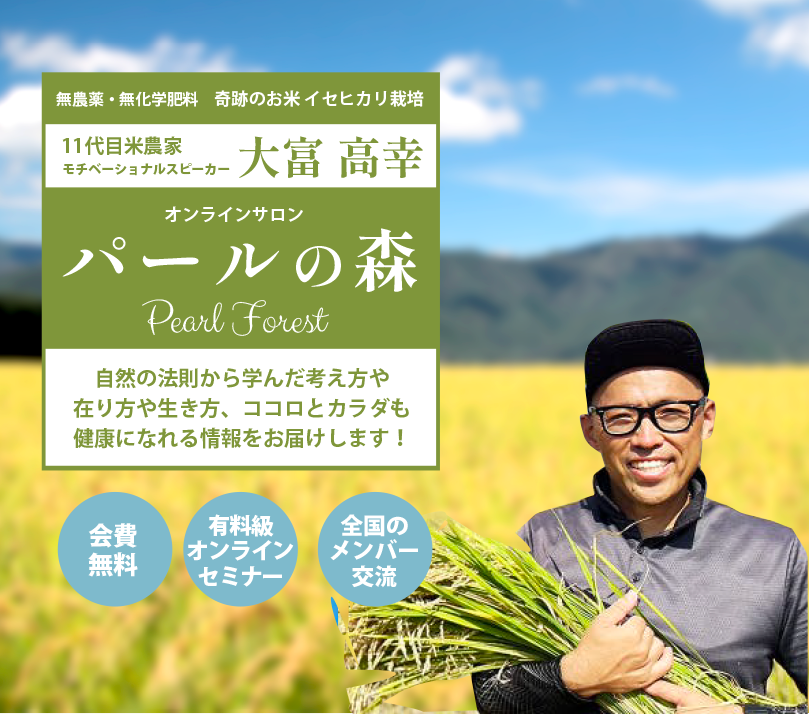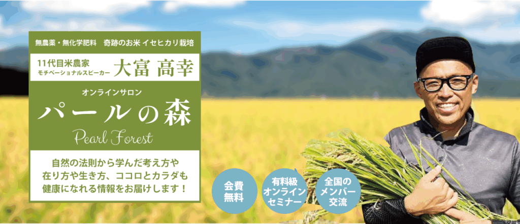 現在は地域の水利システムを守るサラリーマン管理職でありながら、『いせひかり』の大規模自然栽培、酒米の王様『山田錦』とうるち米『ひのひかり』の特別栽培農家として甲子園球場約3個分の農地を守り、ココロとカラダのチューニング無料オンラインサロン『パールの森』の管理人、モチベーショナルスピーカーとして圧倒的情熱と行動力で精力的に活動中。
